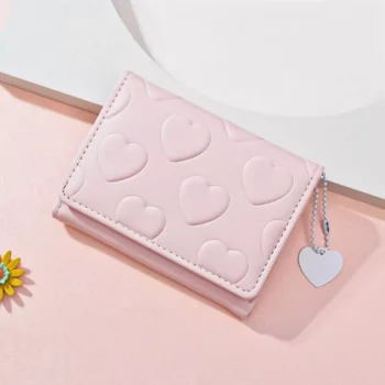 Genuine Leather Mini Wallet with Heart Decoration & Pearl Accent