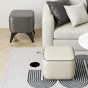Elegant Gray Faux Leather Storage Ottoman Stool with Natural Pinewood Trim