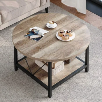 Rustic Oak Round Coffee Table with Metal Legs & Storage