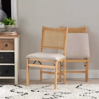 Elegant Natural Wood and Rattan Folding Chair with Upholstered Beige Seat